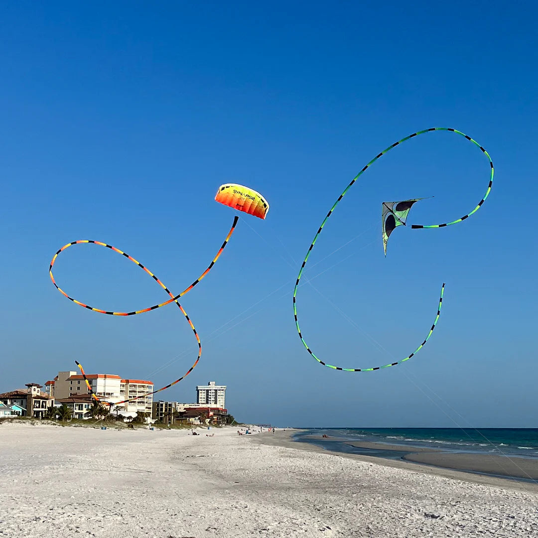 Our eye-catching tube tails inflate in flight to add drama to any single or dual-line kite. Swivel clip attaches to virtually any kite so you can clip one or more onto the spine, wingtips, or your flying line. Comes in a handy drawstring pouch for easy storage and multiples can be joined end to end for extra pizazz. Velcro closure at the tip makes it easy to drain sand and air as you put it away.